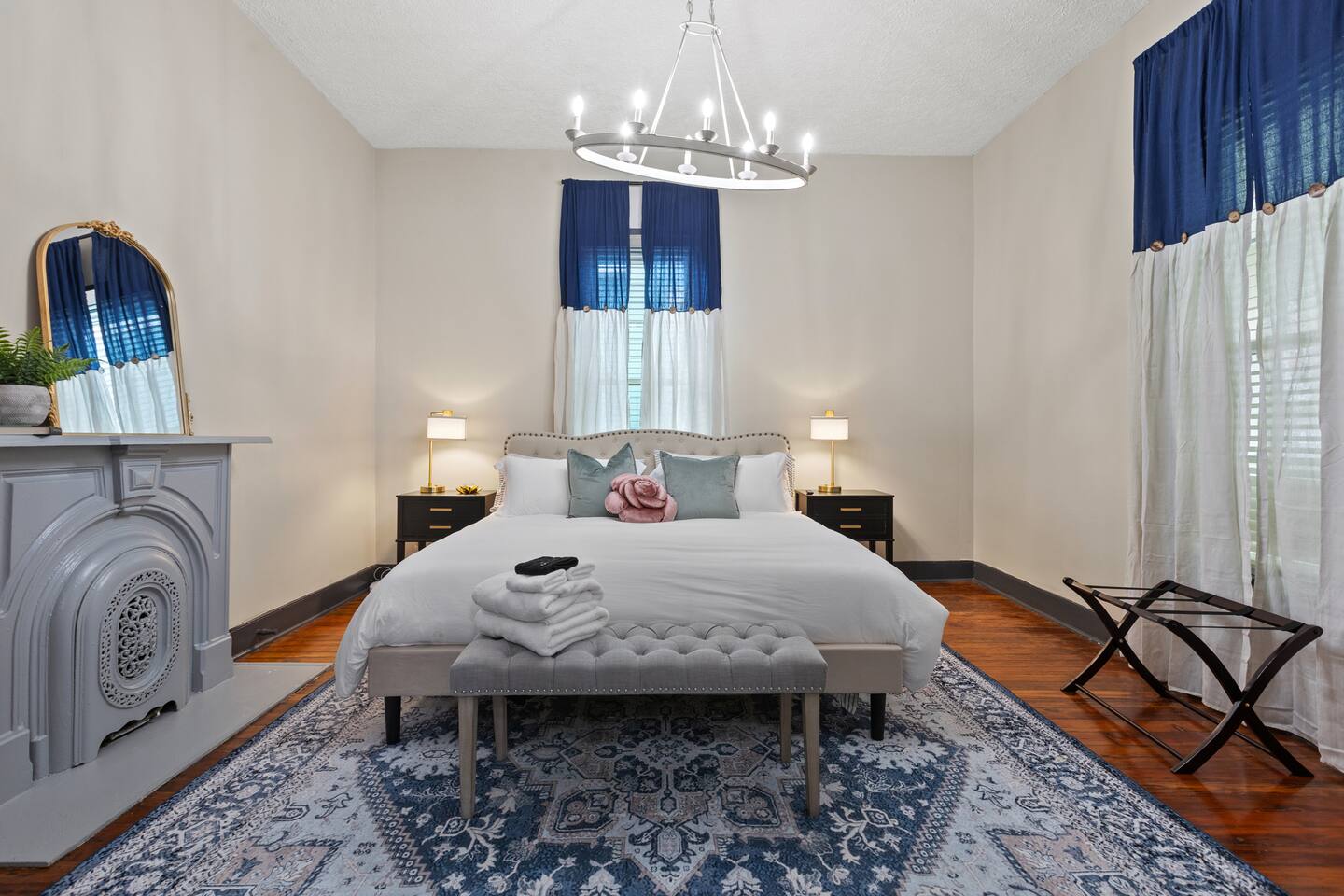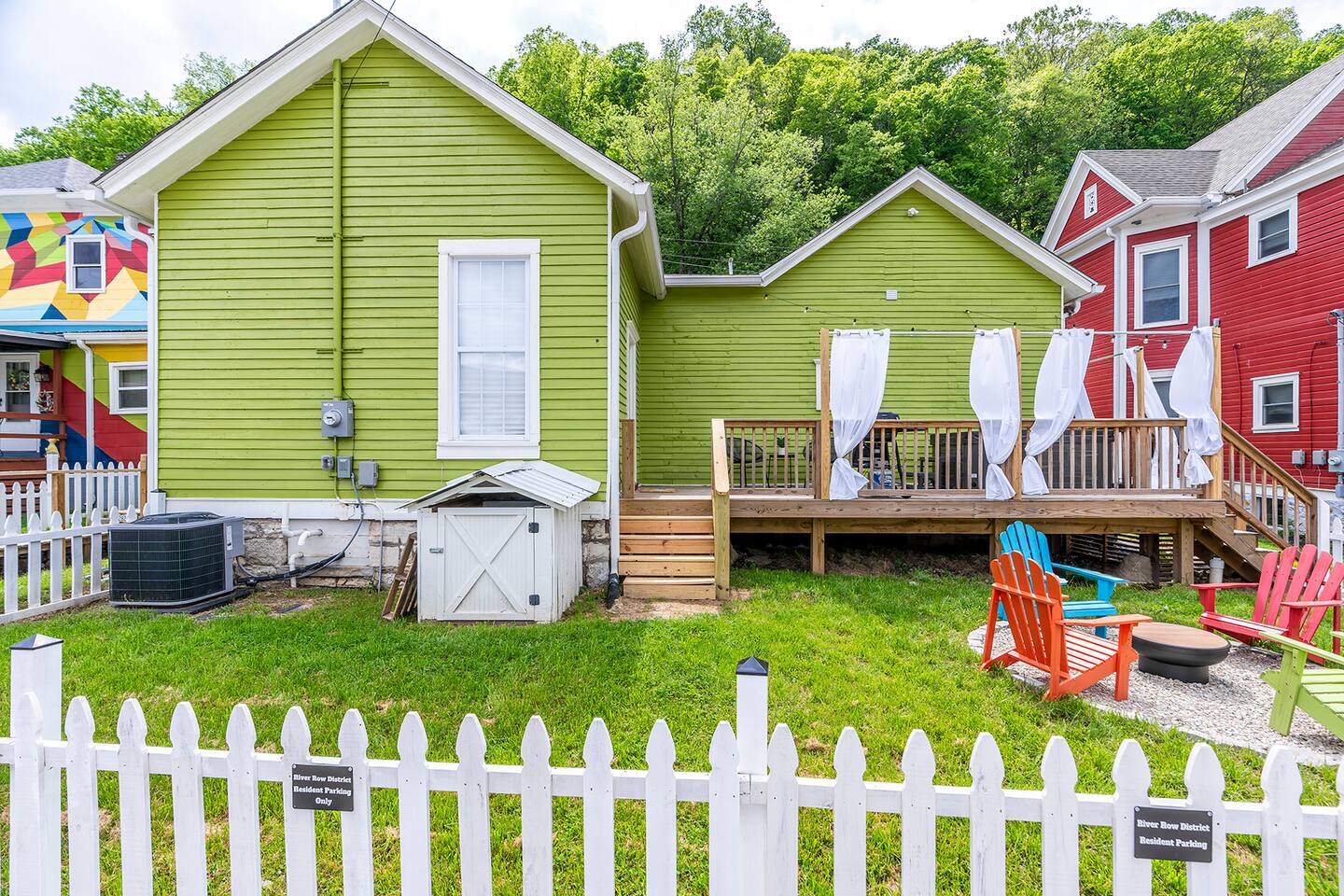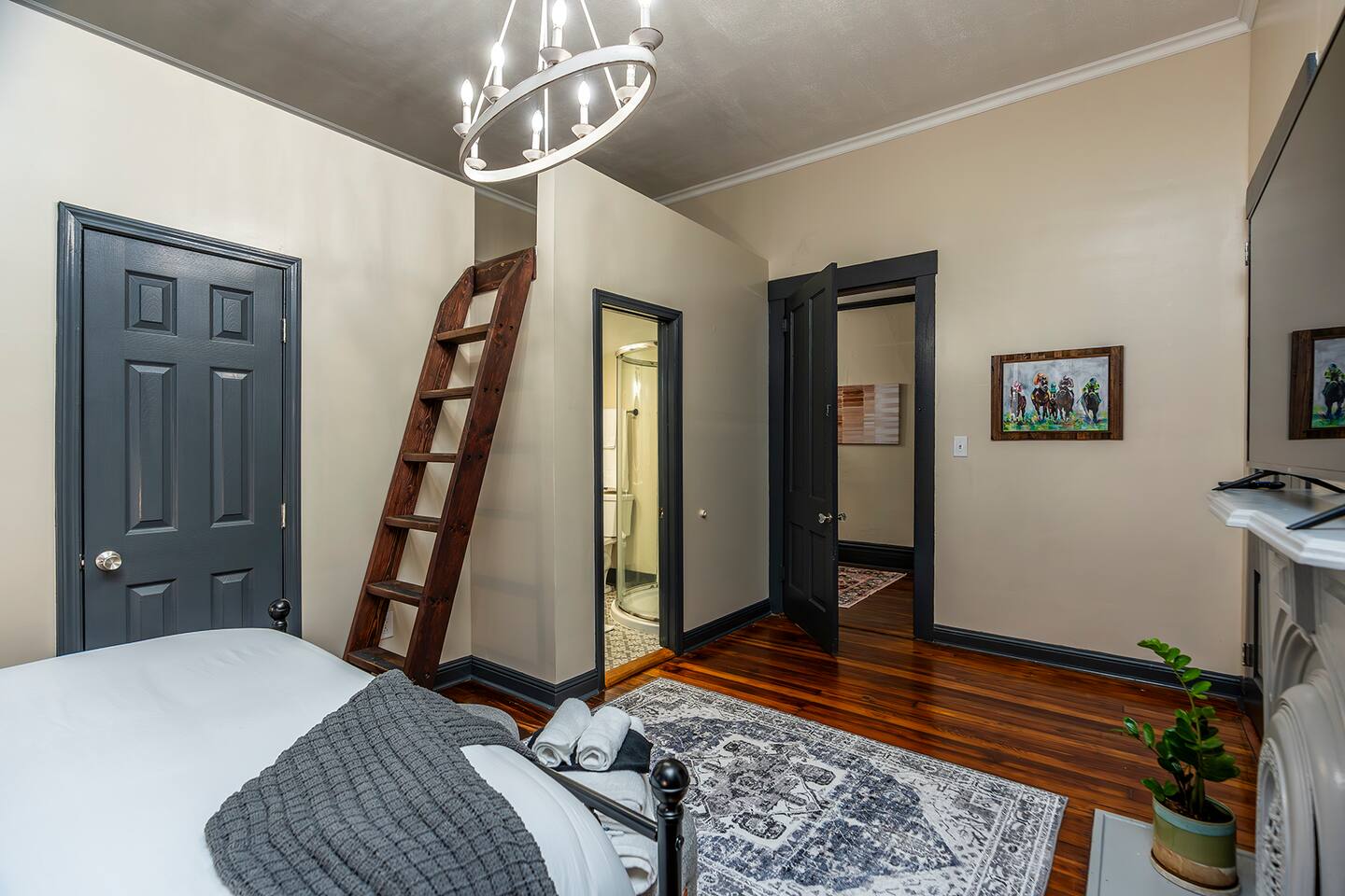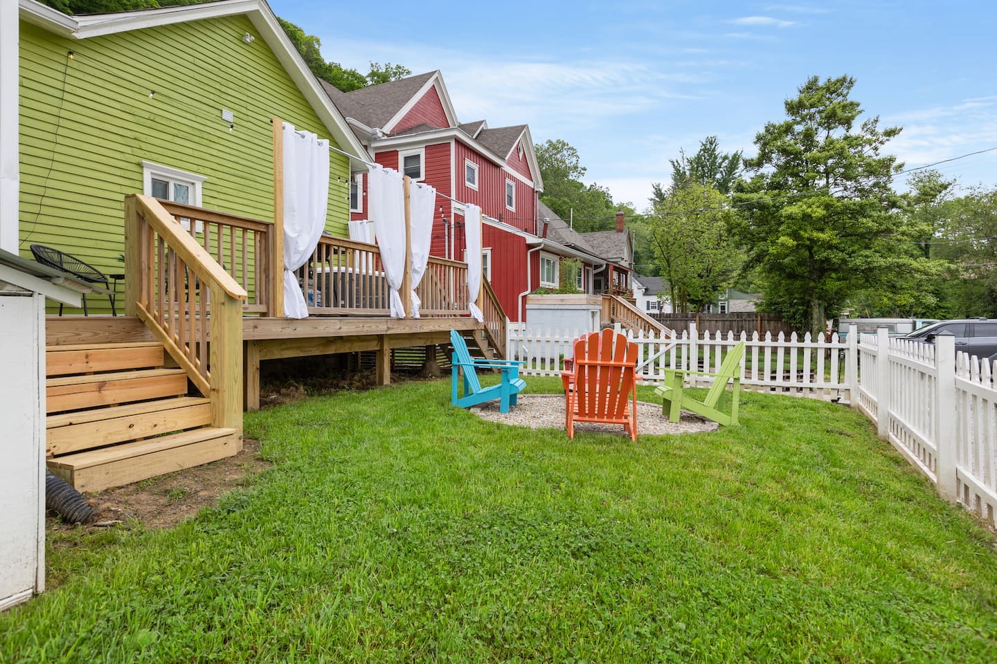 Remodeled historical bungalow with large rooms. Two of which have king beds. One with a walk in closet, allowing for ample storage. One bedroom with a queen bed and walk in closet with en suite bathroom. There is a loft space included in the bedroom with two twin beds, great for your older kids or young adults. (Built in permanent ladder to get to loft for access) Home offers deck in the back of the home, and a fully enclosed backyard across from the River Row Boat house. Perfect for summer night entertaining.
