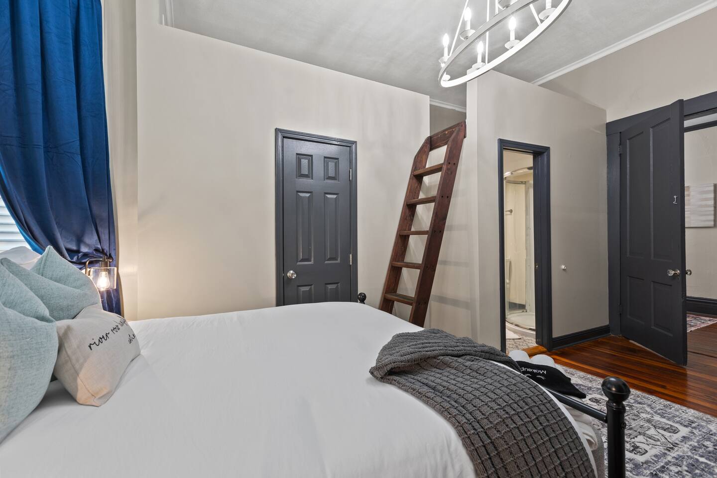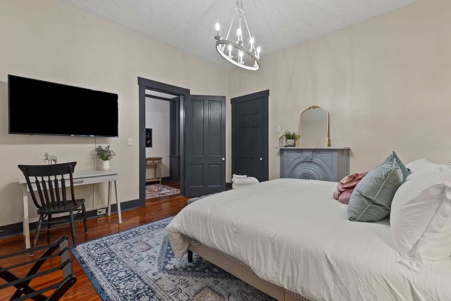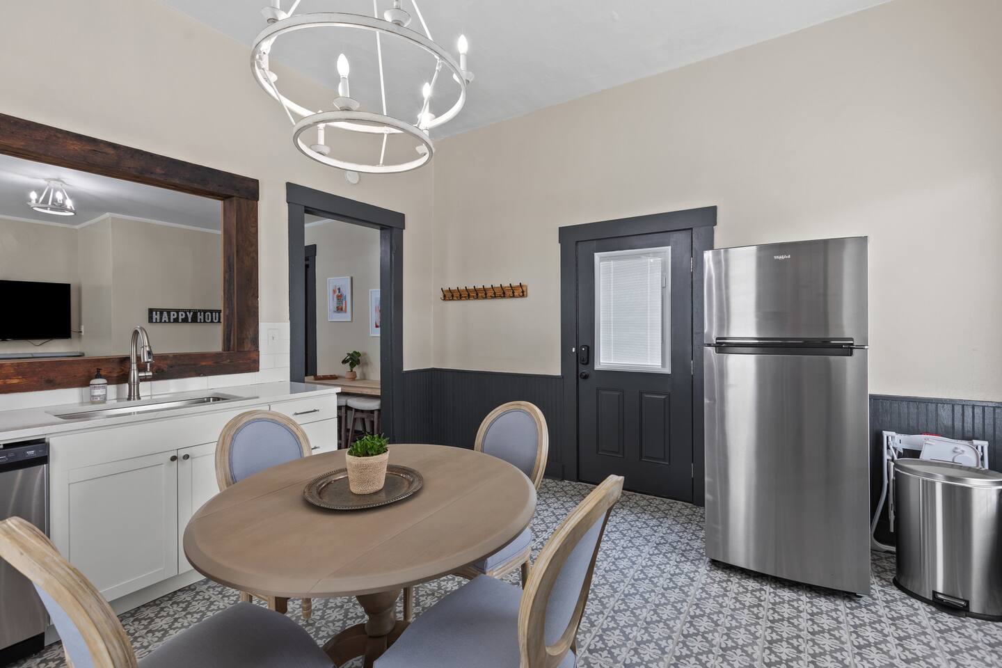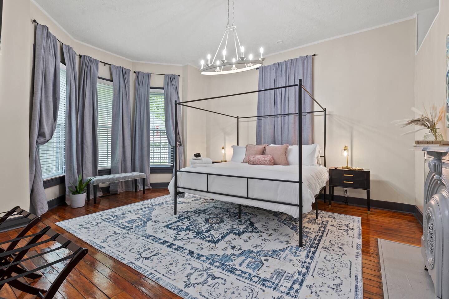 Remodeled historical bungalow with large rooms. Two of which have king beds. One with a walk in closet, allowing for ample storage. One bedroom with a queen bed and walk in closet with en suite bathroom. There is a loft space included in the bedroom with two twin beds, great for your older kids or young adults. (Built in permanent ladder to get to loft for access) Home offers deck in the back of the home, and a fully enclosed backyard across from the River Row Boat house. Perfect for summer night entertaining.