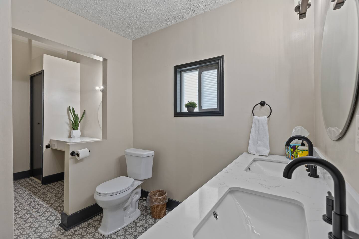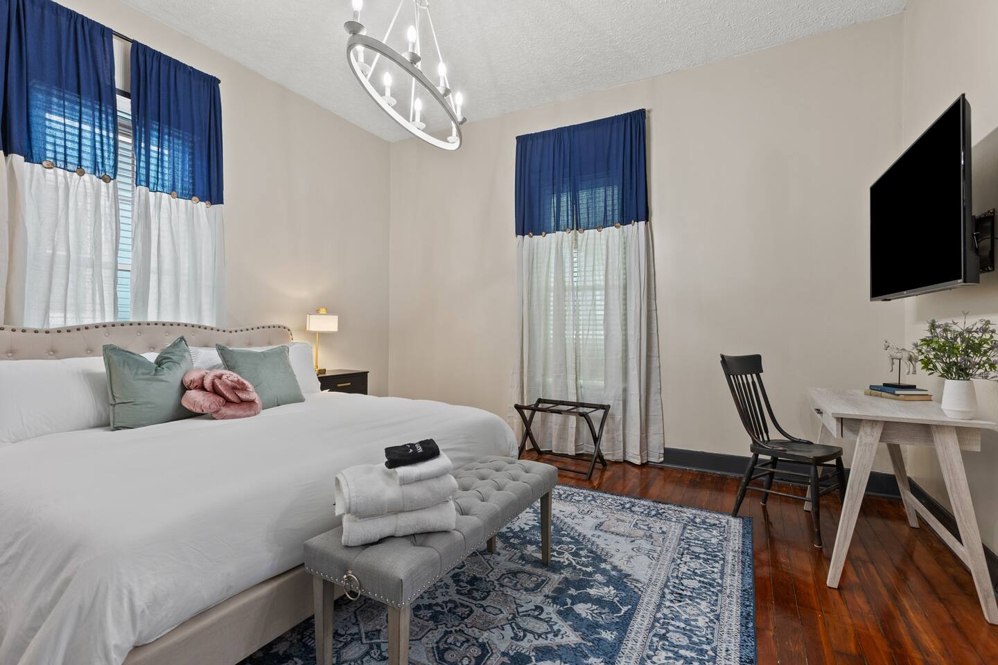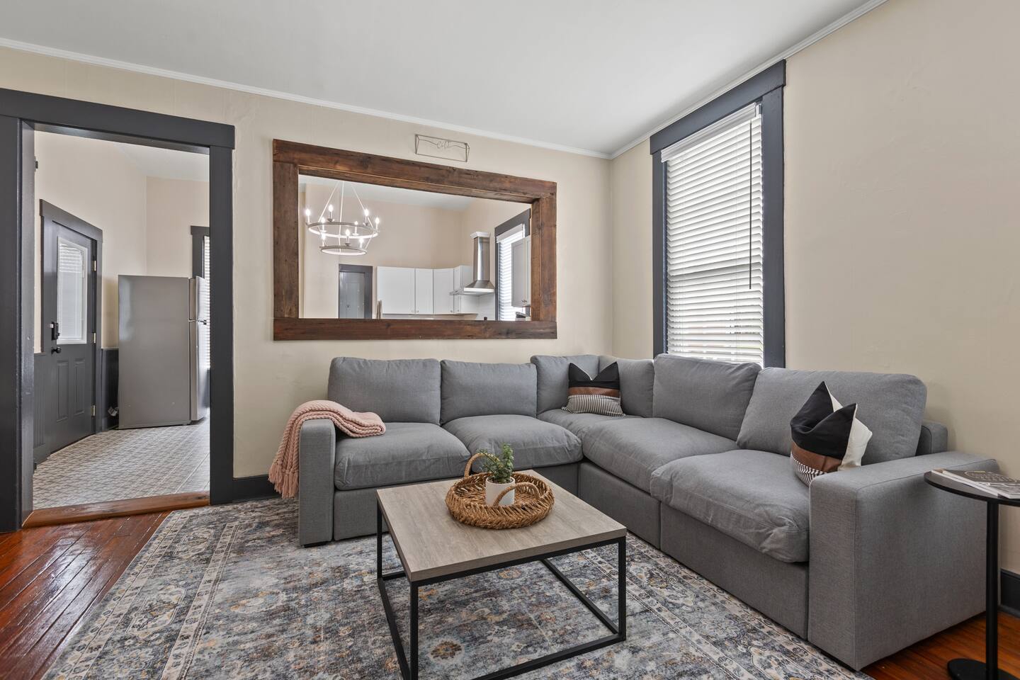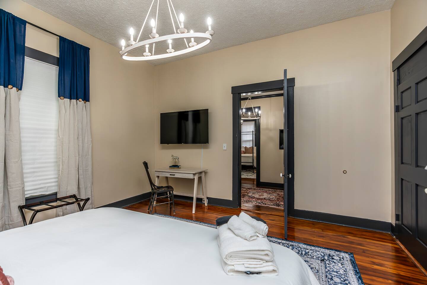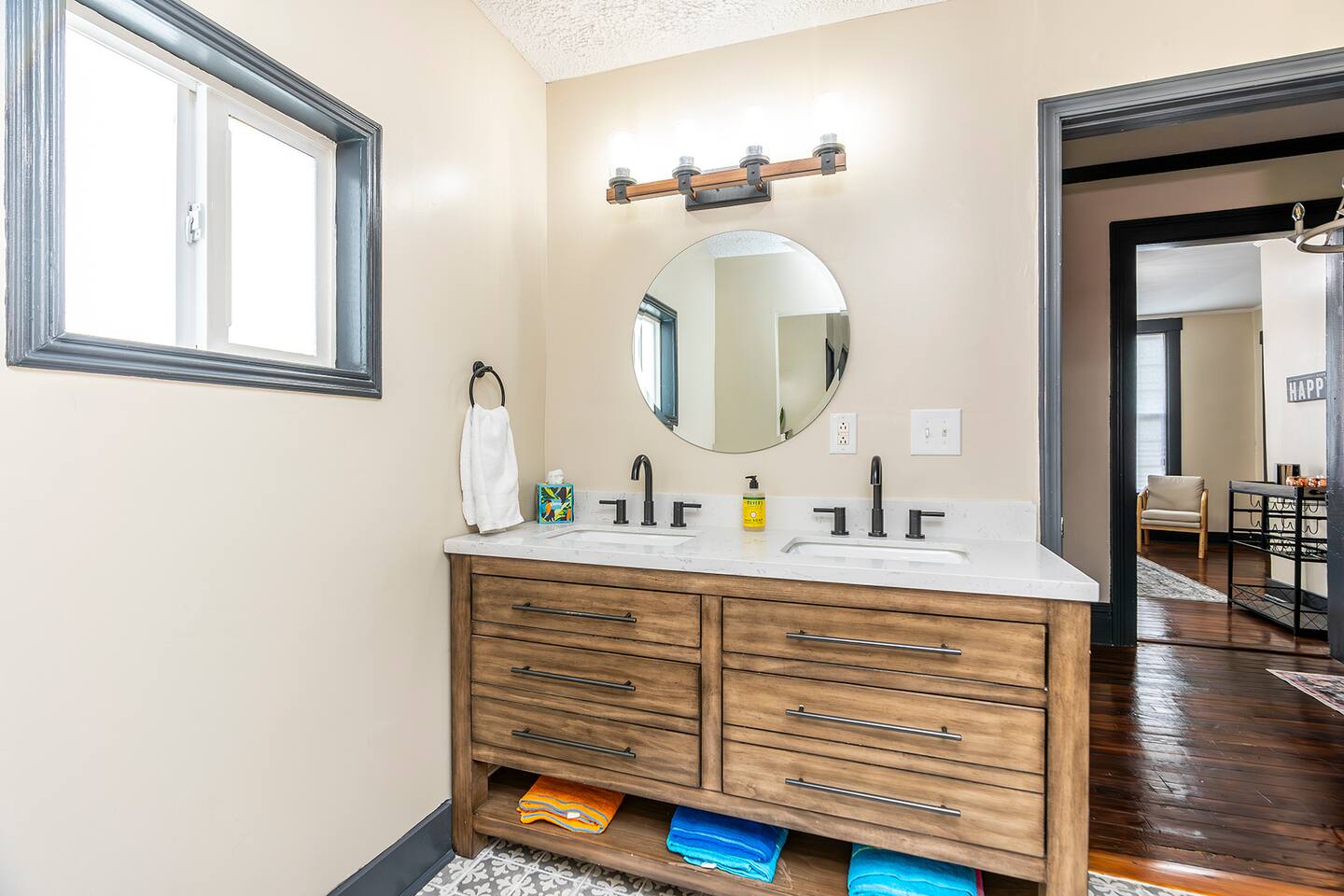 Remodeled historical bungalow with large rooms. Two of which have king beds. One with a walk in closet, allowing for ample storage. One bedroom with a queen bed and walk in closet with en suite bathroom. There is a loft space included in the bedroom with two twin beds, great for your older kids or young adults. (Built in permanent ladder to get to loft for access) Home offers deck in the back of the home, and a fully enclosed backyard across from the River Row Boat house. Perfect for summer night entertaining.