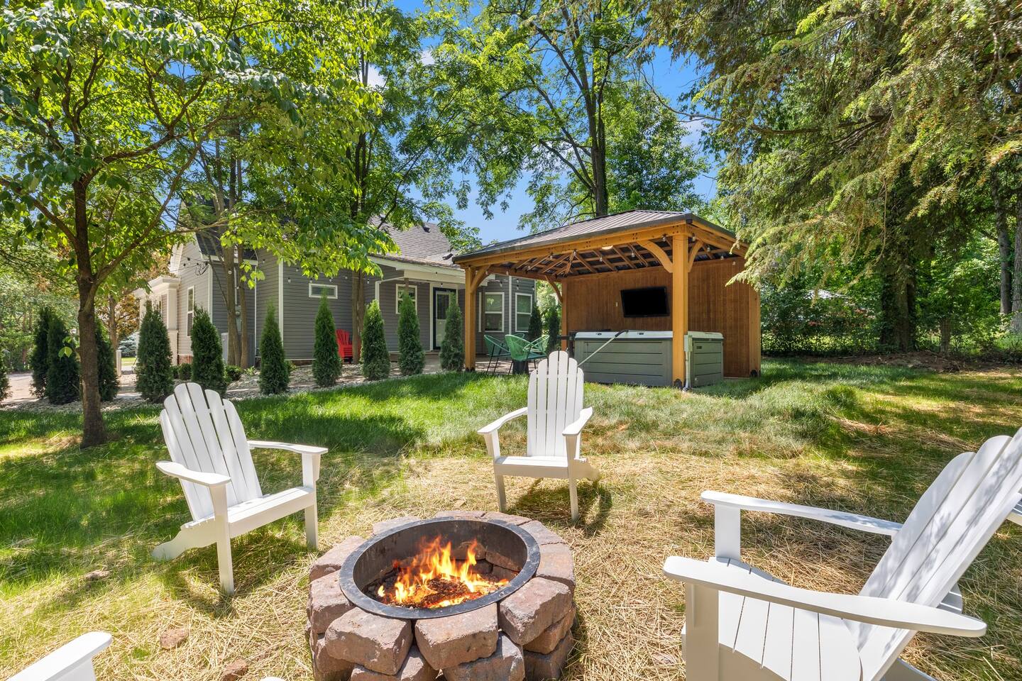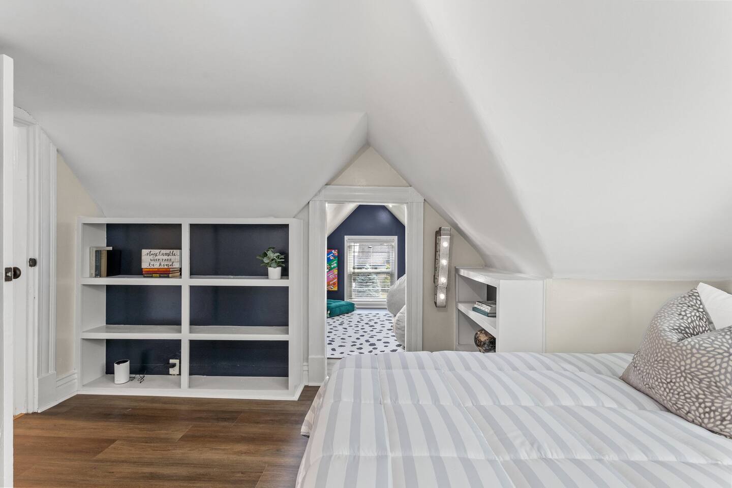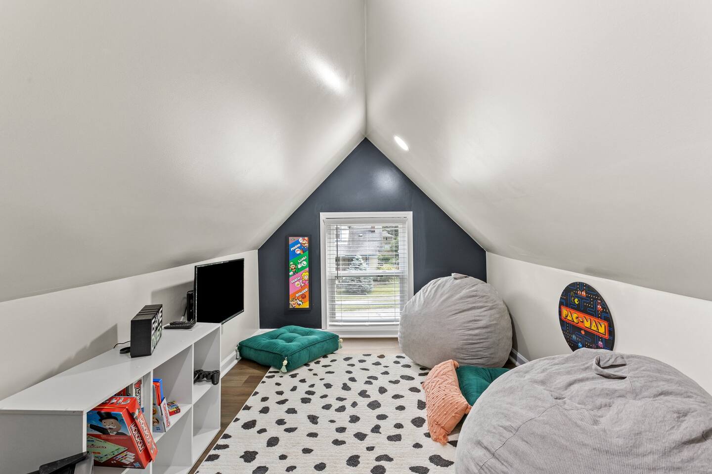 This beautiful remodeled bungalow offers a spacious bedroom with a king bed at the front of the house on the first level. The second bedroom is located at the back of home offering a queen bed. Beautiful light filled spacious living room that leads into a full dining space. We have a fully equipped kitchen with new appliances. From the kitchen, you will be beckoned to the back yard where you will enjoy the hot tub, fire pit outdoor tv with roku system and fire pit with friends. The upstairs offers a bedroom with two twin bed and a full attached bathroom. There is a loft style game room off of the top bedroom. Equipped with a tv and retro gaming console and mini fridge. *please note, this is a two story home with stairs and loft style game room. Ceiling will be lower in the game room.*