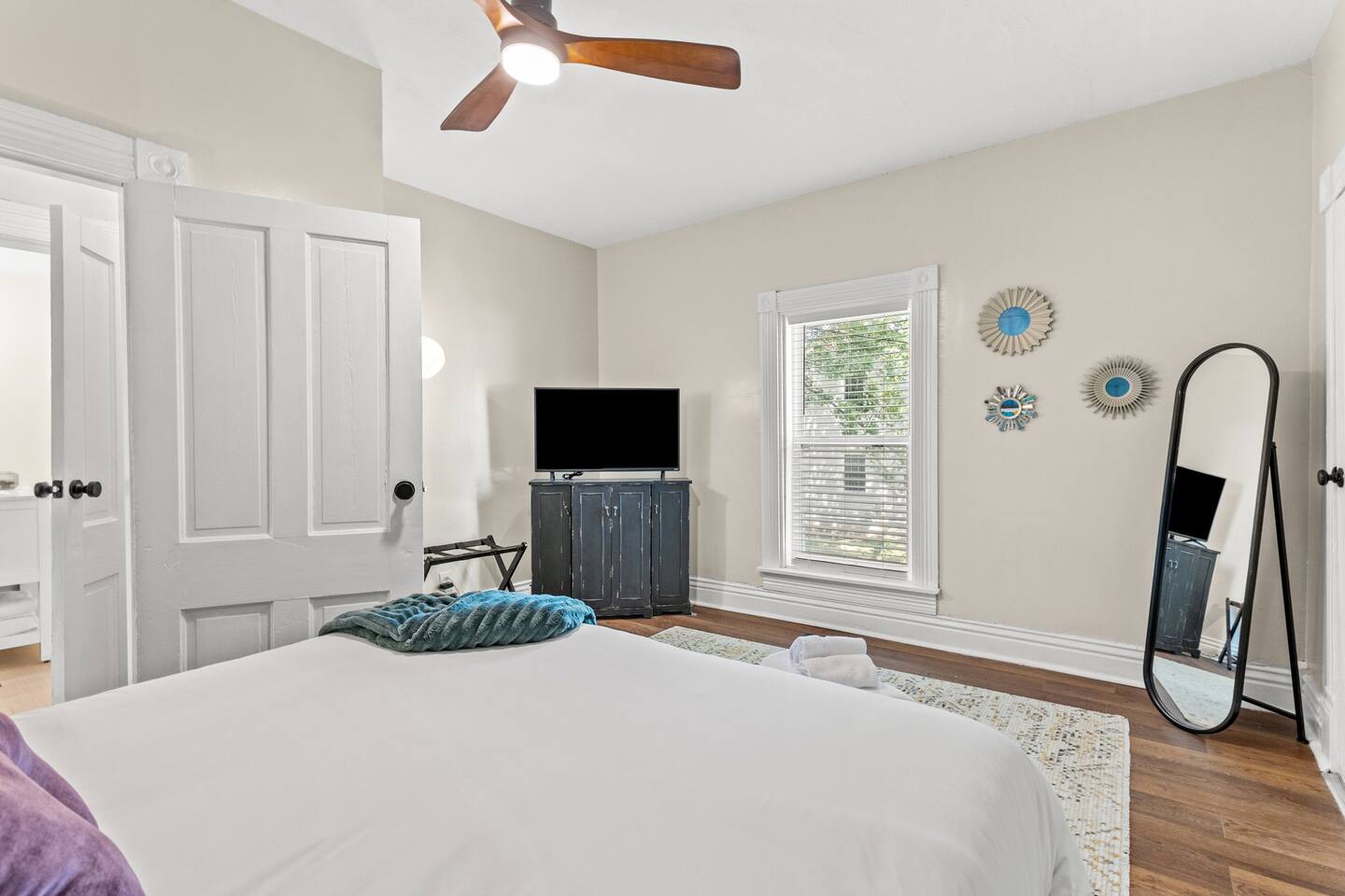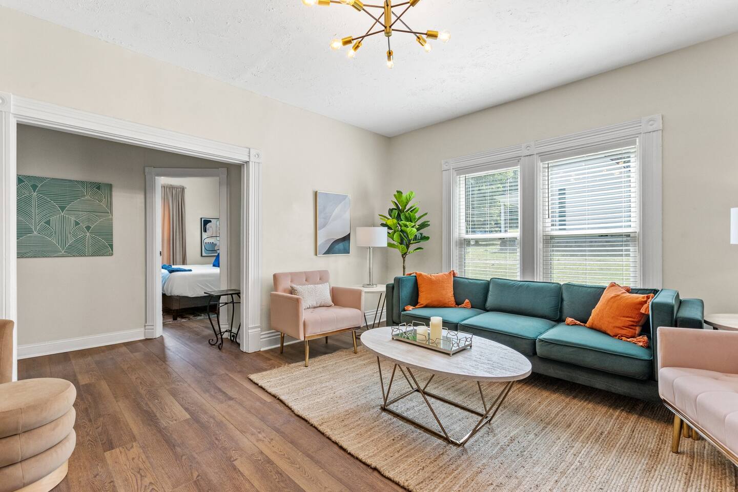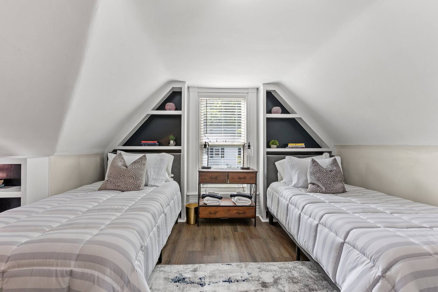 This beautiful remodeled bungalow offers a spacious bedroom with a king bed at the front of the house on the first level. The second bedroom is located at the back of home offering a queen bed. Beautiful light filled spacious living room that leads into a full dining space. We have a fully equipped kitchen with new appliances. From the kitchen, you will be beckoned to the back yard where you will enjoy the hot tub, fire pit outdoor tv with roku system and fire pit with friends. The upstairs offers a bedroom with two twin bed and a full attached bathroom. There is a loft style game room off of the top bedroom. Equipped with a tv and retro gaming console and mini fridge. *please note, this is a two story home with stairs and loft style game room. Ceiling will be lower in the game room.*